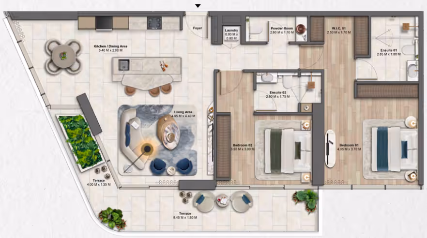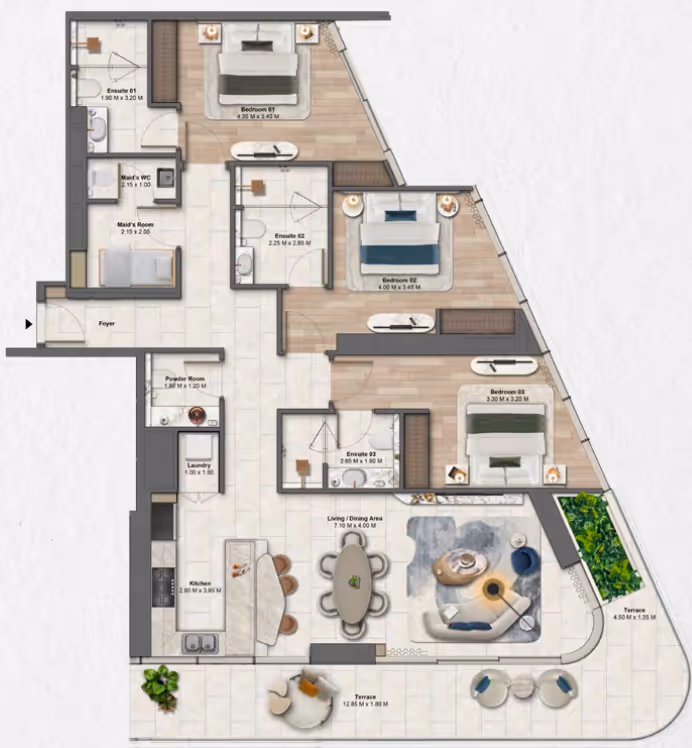 Soulever is a waterfront residential complex in Dubai Maritime City, where the city’s vibrant energy seamlessly blends with the tranquility of the sea and nature. The project features two skyscrapers of 44 and 31 floors, set on a three-level podium surrounded by lush tropical landscaping.The sail-shaped towers, catching the wind, are an elegant reference to Dubai’s maritime heritage.The project offers 1–3 bedroom apartments, 4-bedroom duplexes, 5-bedroom penthouses, and only 8 exclusive 2-bedroom chalets. Interiors are designed in a warm minimalist style with an emphasis on natural materials. The residences boast breathtaking panoramic views of the bay, the sea, and the Dubai skyline.