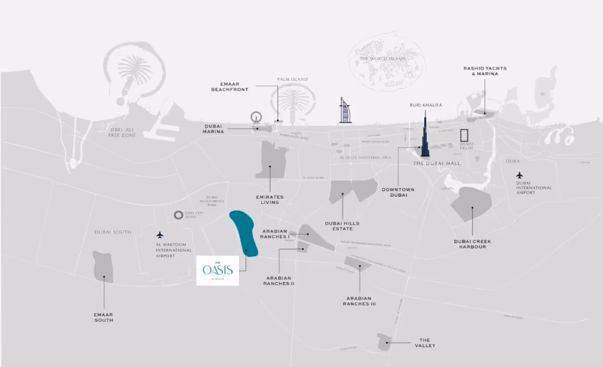 The Oasis is strategically located with easy access to key destinations such as Burj Khalifa, Downtown Dubai, Dubai International Airport, Sheikh Zayed Road, and The Dubai Mall.